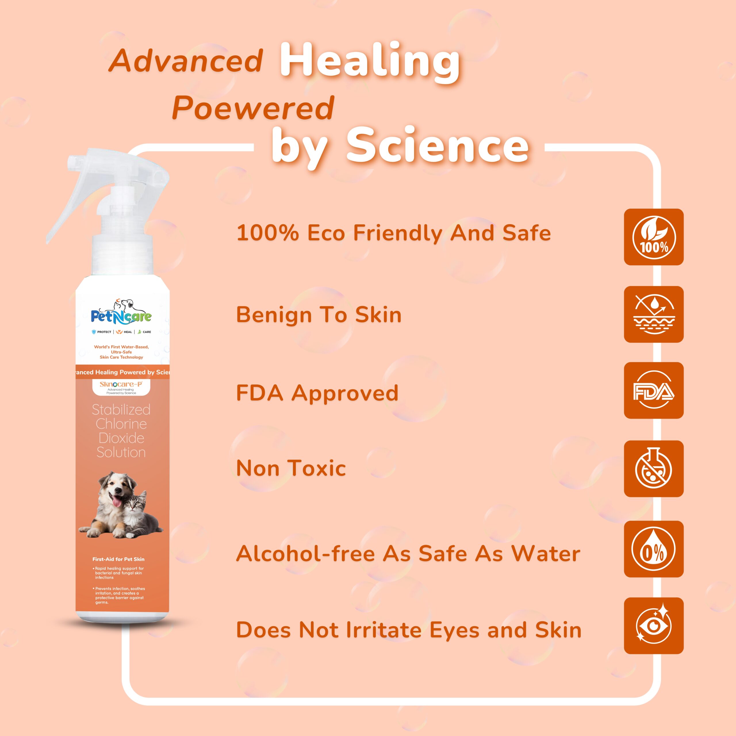 SknOcare-P is a water-based, vet-tested topical solution formulated to give fast, gentle relief for common pet skin problems. Using Advanced Oxidation Technology, SknOcare-P neutralizes harmful bacteria and fungi at the skin surface without steroids or harsh chemicals — breaking the itch-scratch cycle and supporting natural healing.