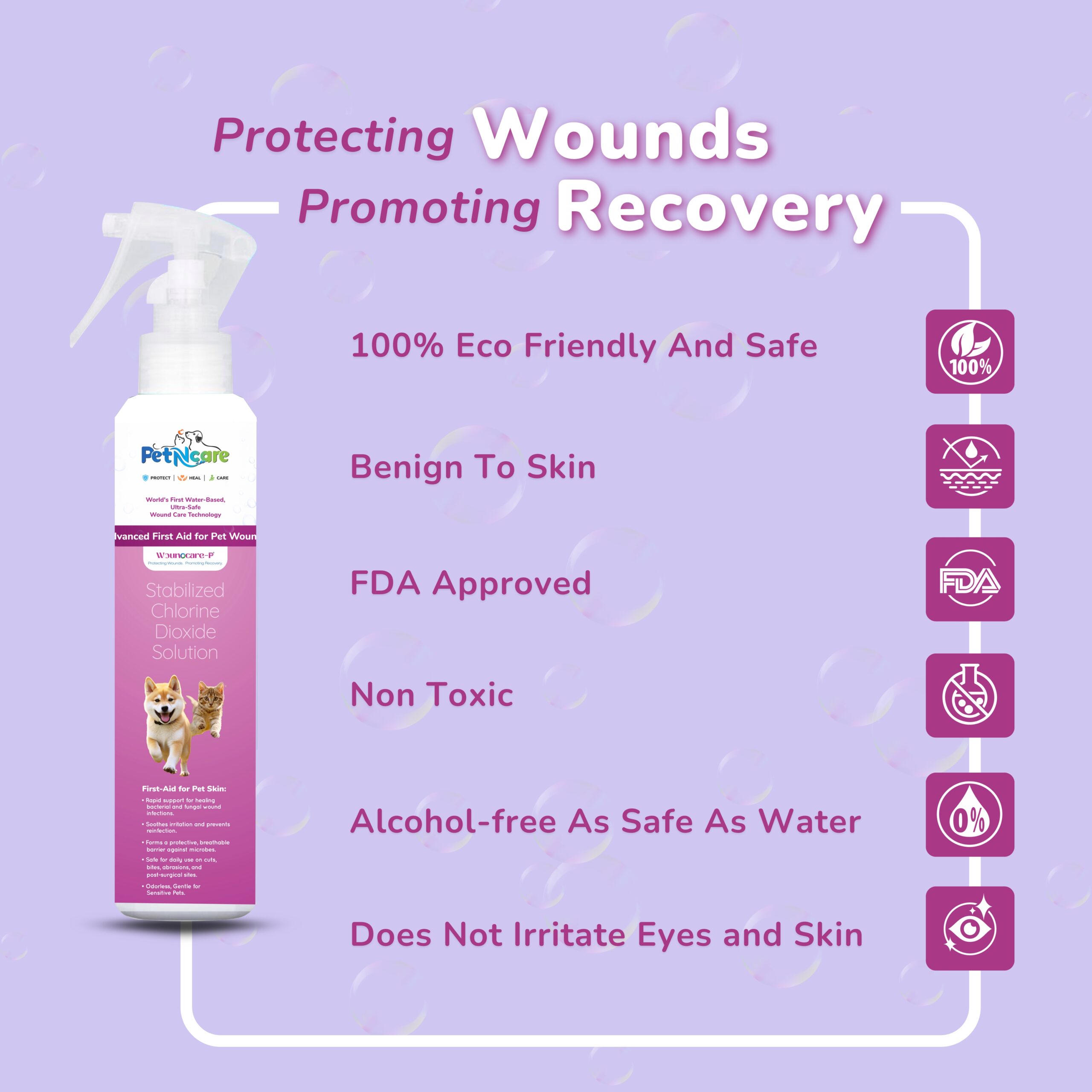 WounOcare-P is a stabilized chlorine dioxide (SK-C molecule) water-based spray created for first-aid treatment of external wounds on pets. Its gentle, non-irritating formulation supports wound hygiene by reducing microbial load around the injury site and minimizing the risk of reinfection.